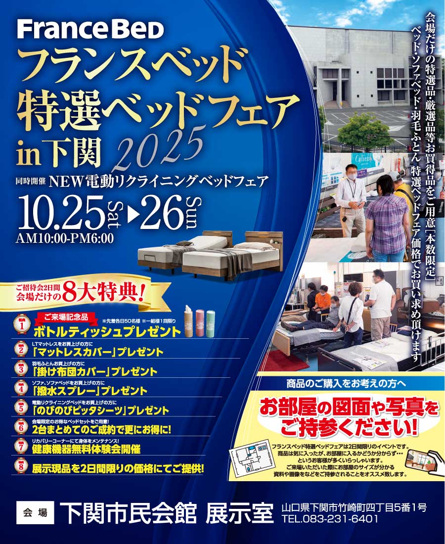 「フランスベッド in 下関|特選ベッドフェア」を開催する下関市民会館の特設会場には、ベッドメーカーならではの魅力ある商品が一堂に展示。フランスベッド・正規販売店エーアイディーのスタッフが、皆さまの快適な生活空間を実現するインテリアコーディネートのお手伝いをいたします。