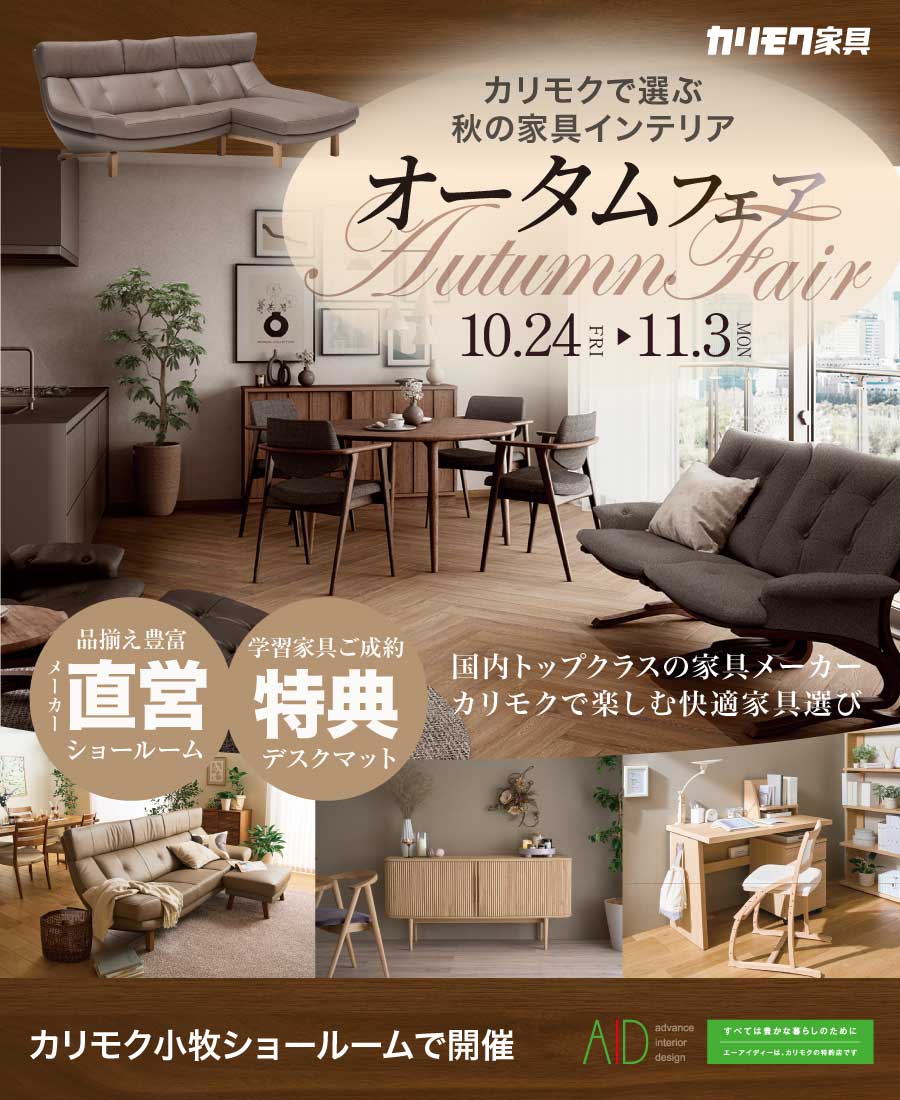 カリモク家具が公認する国内唯一の「特約店」株式会社エーアイディーが家具フェアを開催!メーカーショールームを会場にダイニングやソファ、学習デスクなど、豊富な種類の家具を存分に比較、ご体感いただけます。お気に入りの家具は会場でエーアイディーの特典お見積りでご案内します!この機会に是非ご来場ください。