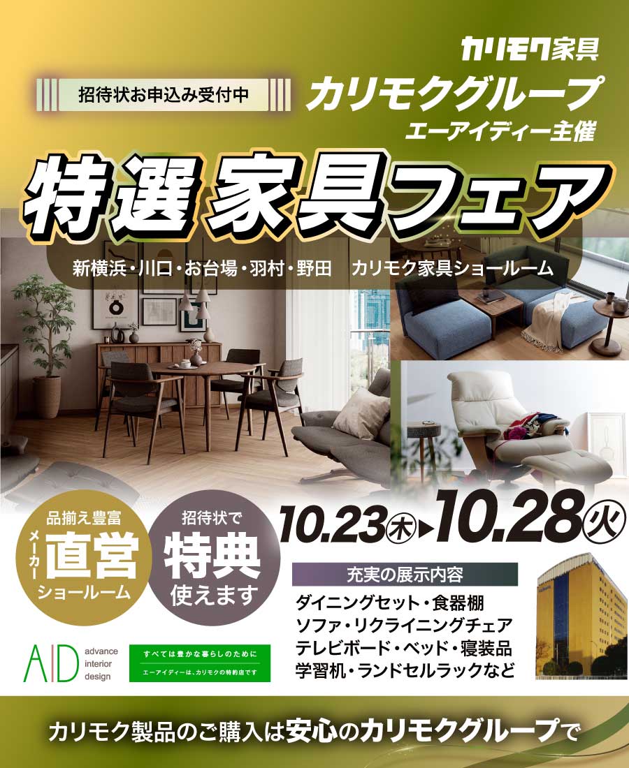 ■カリモク新横浜ショールームと鶴見アウトレットに特別ご招待。特約店エーアイディー主催フェアへお申込みで、フェア特典付きにてカリモク家具をご購入頂けます。