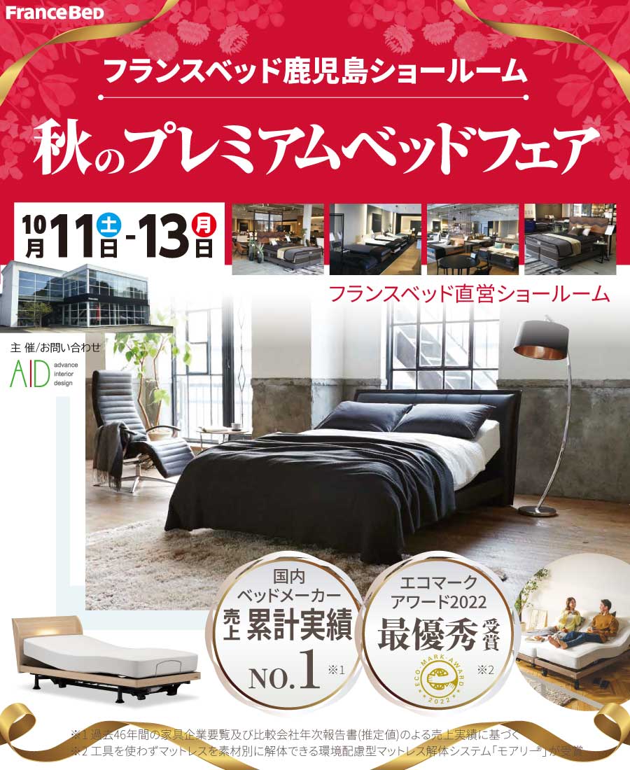 フランスベッド直営の鹿児島ショールームで、秋のプレミアム決算フェアを開催します。