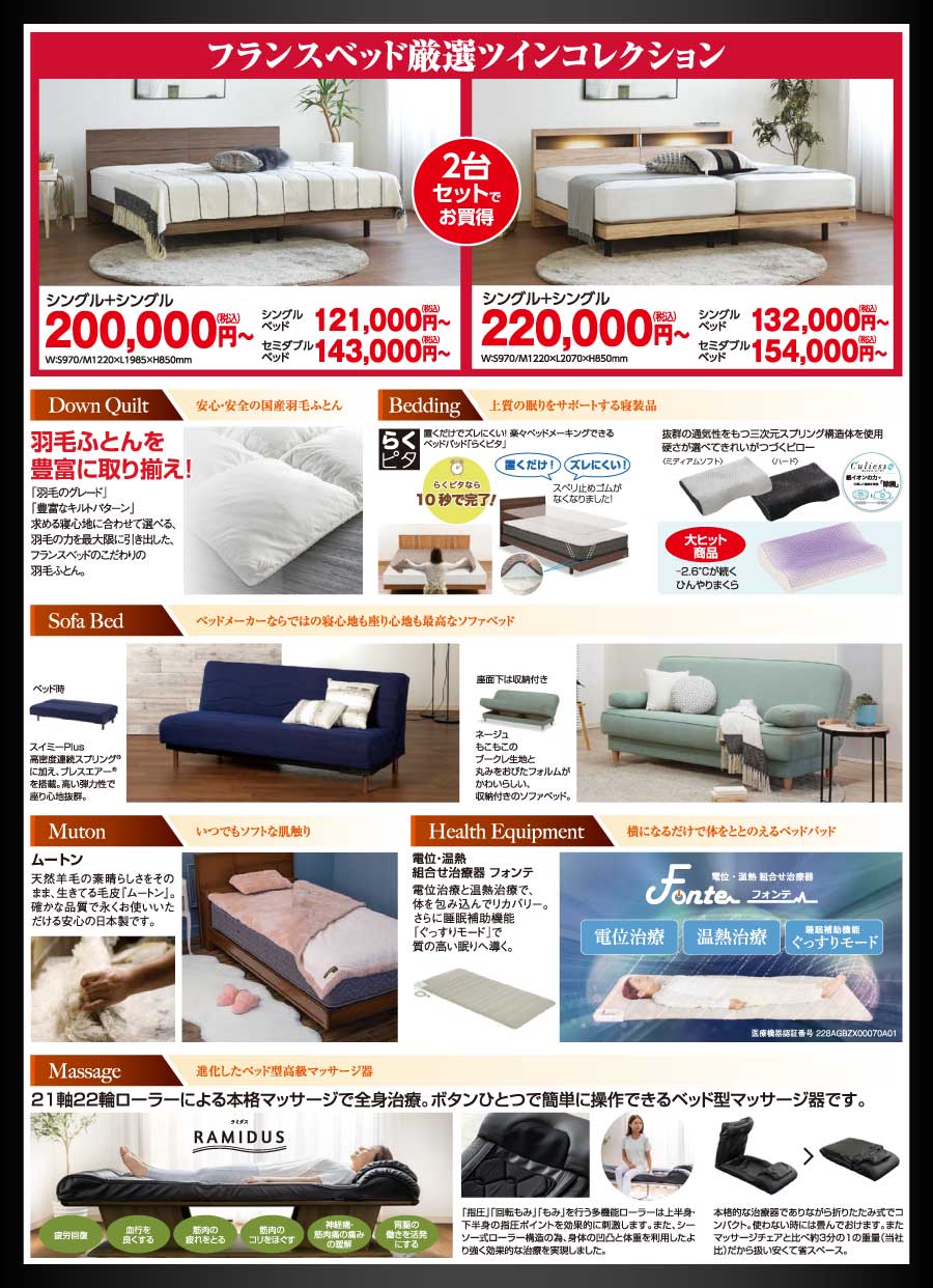 セミシングルベッドフレーム・シングルベッドフレーム・セミダブルベッドフレーム・ダブルベッドフレーム・ワイドダブルベッドフレーム・クィーンベッドフレーム・キングベッド・セミシングルマットレス・シングルマットレス・セミダブルマットレス・ダブルマットレス・ワイドダブルマットレス・クィーンマットレス/LTシリーズ・ブレスエア・スランバーランド・リハッテク・クラウディア・テンセル・介護ベッド・電動リクライニングベッドシングル・電動リクライニングベッドセミダブル・電動リクライニングマットレス・グランマックス・エゼックス・レステックス・宮付きベッド・フラット・レッグ式ベッド・ドロアベッド・跳ね上げ式ベッド(TS、YS)・スノコ式ベッド・ソファ一人掛け・ソファ二人掛け・ソファ二.五人掛け・ソファ三人掛け・総革張りソファ・ドイツ製ソファ・イタリア製ソファ・カウチソファ・エルポ・ソファベッド・パーソナルチェア・リクライニングチェア・マッサージチェア・ピロー・まくら・羽毛ふとん(シングル、セミダブル、ダブル、ワイドダブル、クィーン、キング)・寝装品・ベッドパッド・マットレスカバー・掛けふとんカバー・まくらカバー・ピロケース・ムートンなど