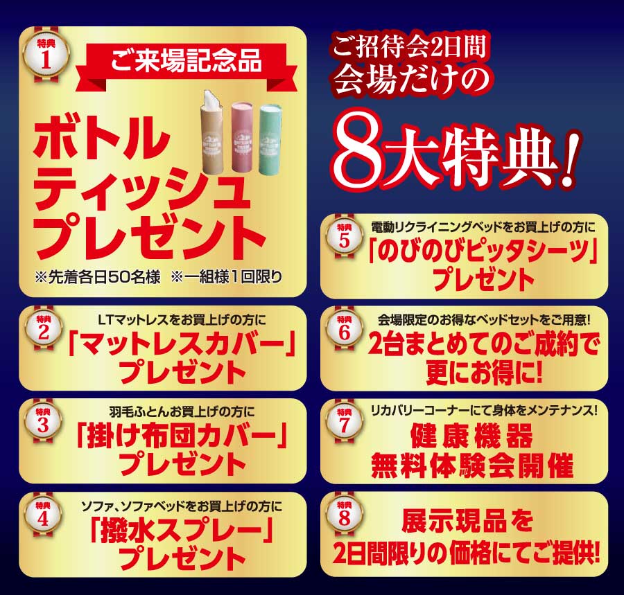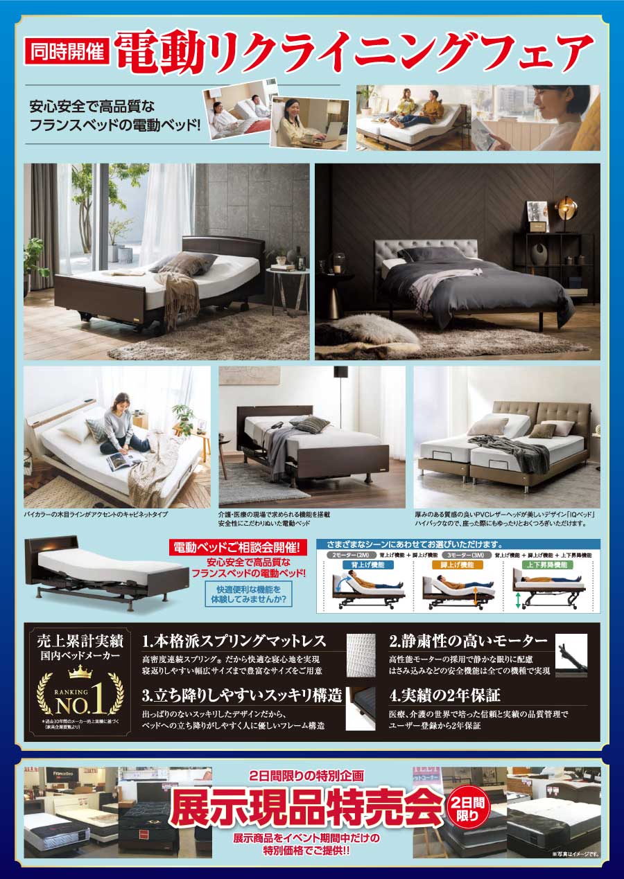 会場には、ベッドメーカーならではの魅力ある商品が一堂に展示。定番商品から新作モデルまで存分にご体感いただけます。フランスベッド・正規販売店エーアイディーが、皆さまの快適な生活空間を実現するインテリアコーディネートのお手伝いをいたします。