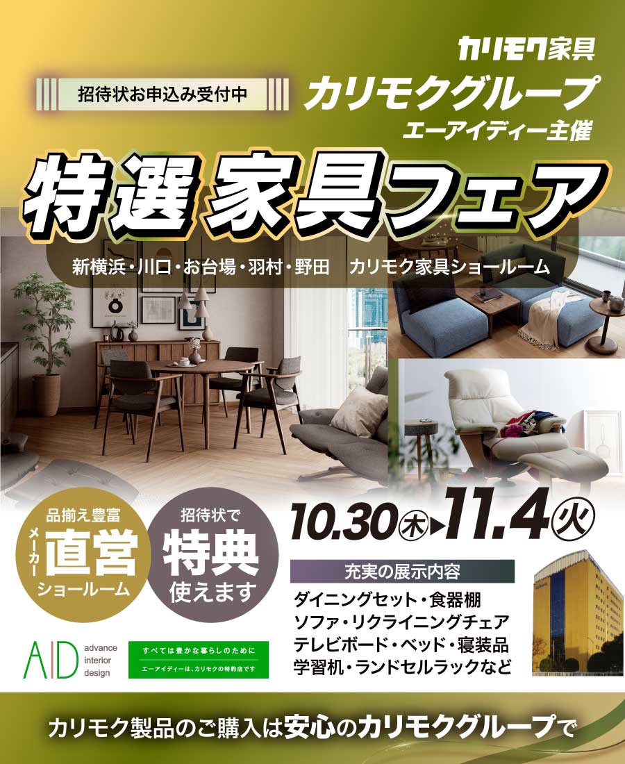 創業70余年、国内トップクラスの家具メーカーカリモク家具ショールームで快適体感しませんか?カリモク家具を知り尽くしたエーアイディーが家具選びをお手伝い。買い替えや新築のコーディネート、修理の相談まで、お気軽にご相談ください。