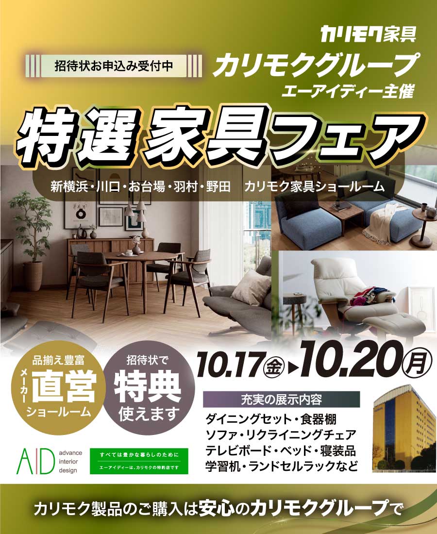 当フェアはカリモクグループ小売事業会社エーアイディーがカリモク家具ショールームで開催するカリモク家具専門のフェアです。メーカー直営ショールームだから、カリモク製品の種類・バリエーション、展示数はエリア随一。きっとあなたの理想のスタイルが見つかります。
