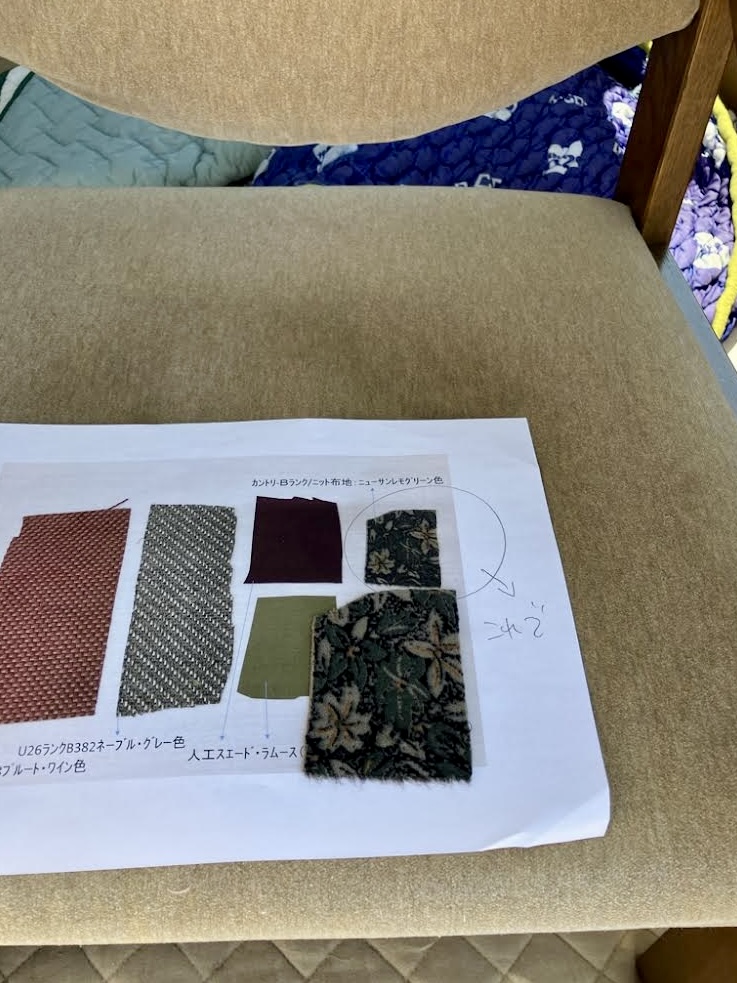 コストを抑えるため、職人が在庫で手持ちの張地をサンプルとして取り寄せ、「ニューサンレモ・グリーン色」にて張り替えを承りました。