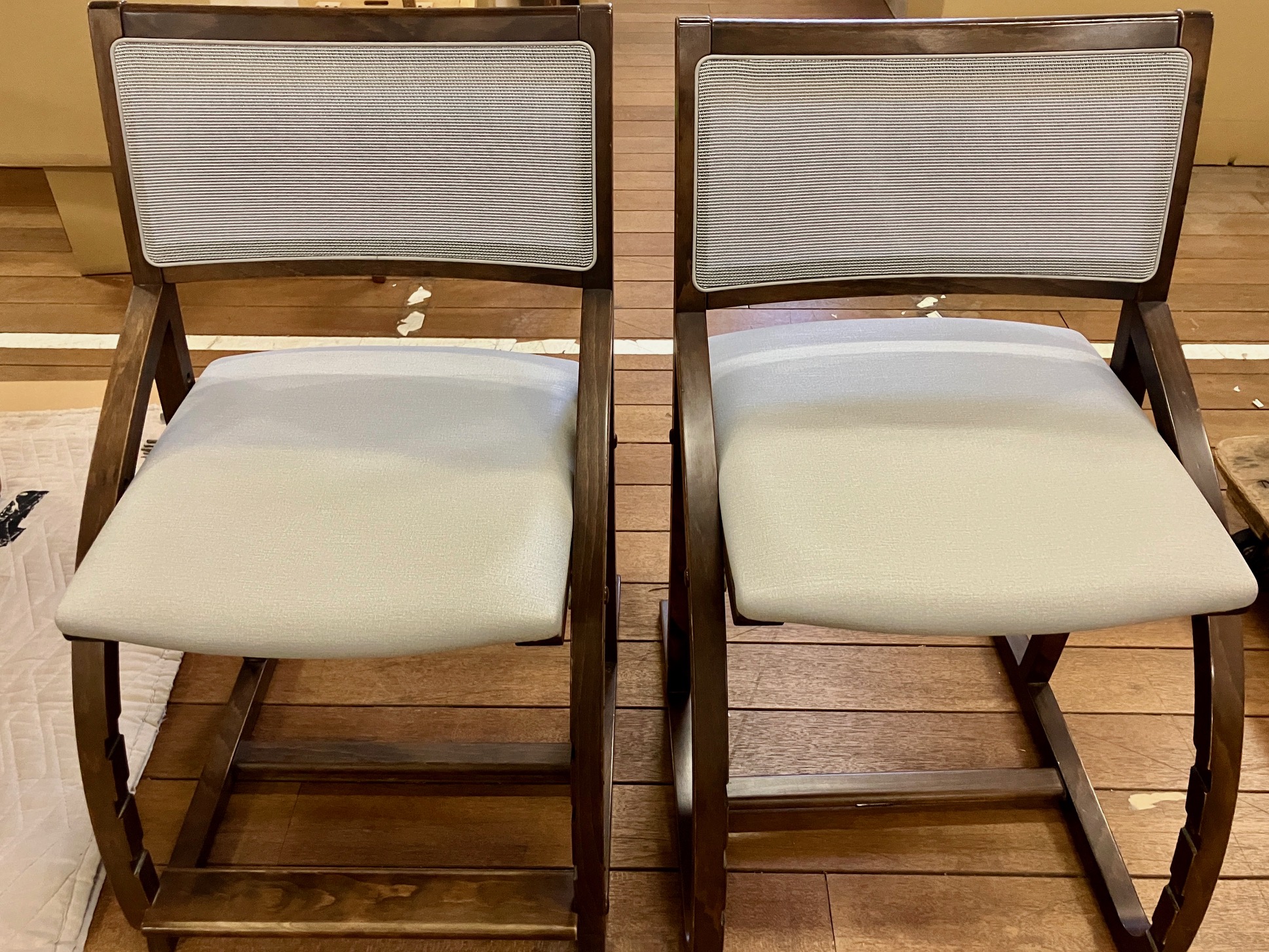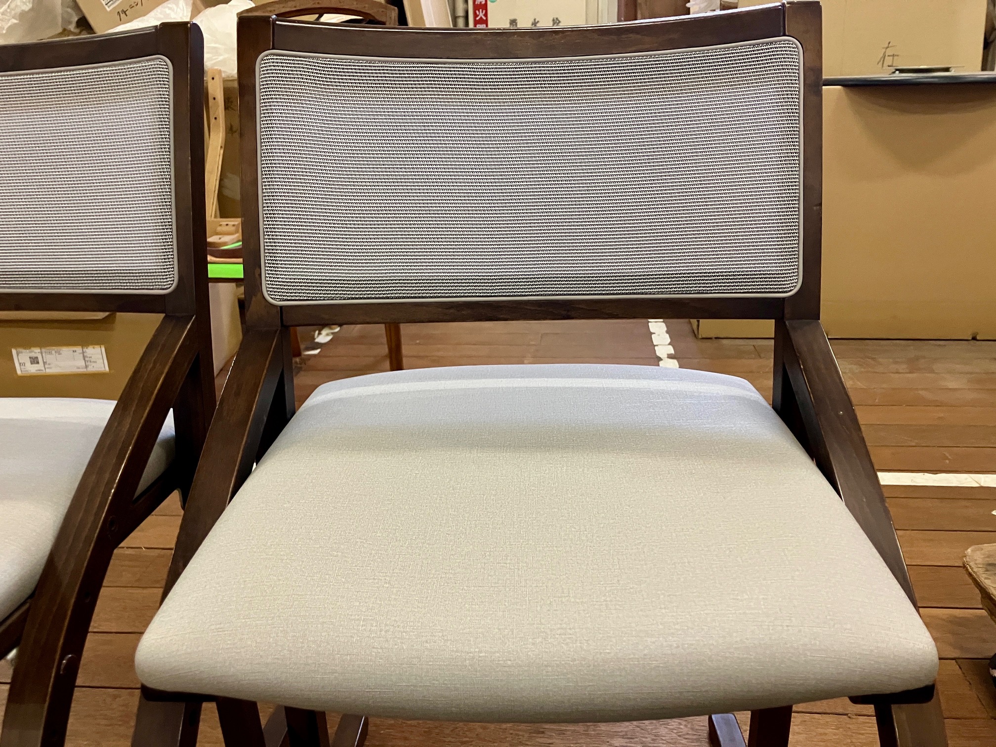 長年のご使用により、背もたれメッシュの汚れと座面張地の劣化が気になるとのご相談でした。修理にあたり、メッシュの張り替えと座面シートはマニエラ・ライトグレーで手配させていただきました。