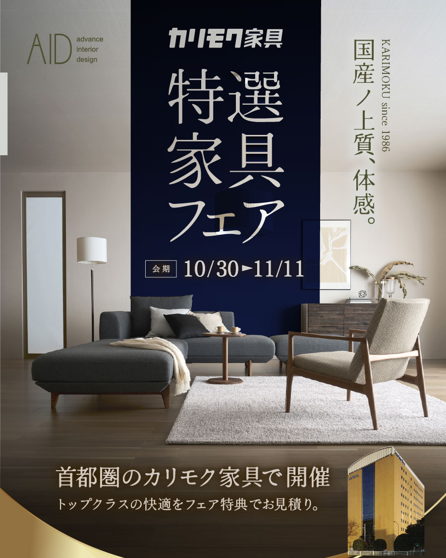 当フェアはカリモクグループ小売事業会社エーアイディーがカリモク家具ショールームで開催するカリモク家具専門のフェアです。メーカー直営ショールームだから、カリモク製品の種類・バリエーション、展示数はエリア随一。きっとあなたの理想のスタイルが見つかります。